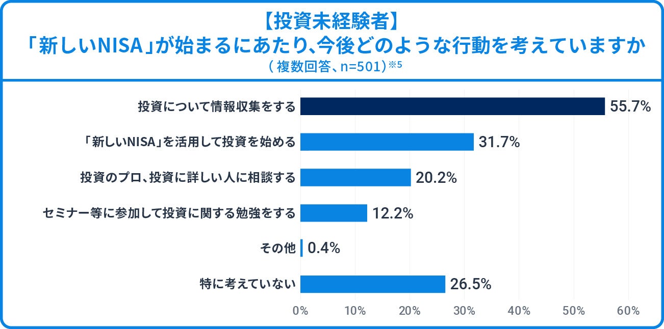 ※5 ※2の「投資未経験者」への質問。「『新しいNISA』が始まるにあたり、あなたは今後どのような取り組み・行動をお考えですか。 あてはまるものをすべてお選びください」への回答(複数回答、回答者数:501人、小数点第2位を四捨五入)