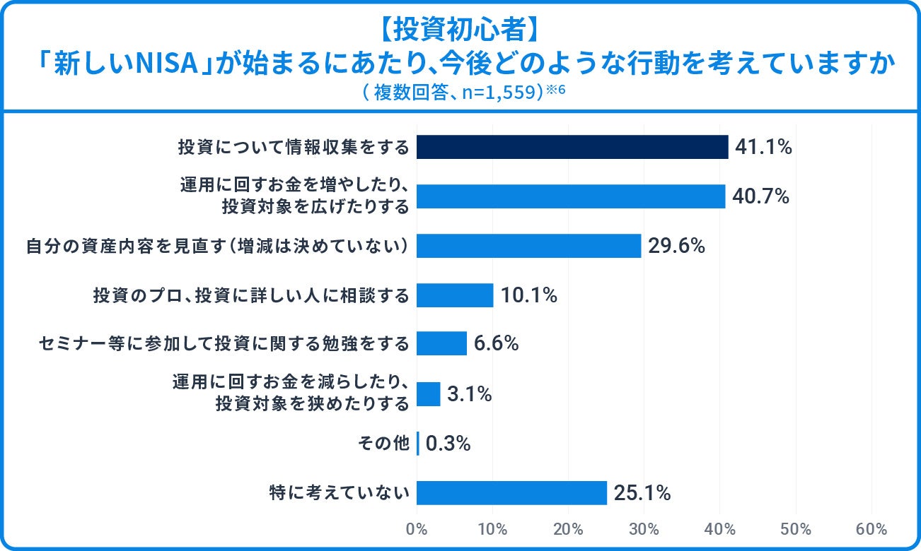 ※6 ※2の「投資初心者」への質問。「『新しいNISA』が始まるにあたり、あなたは今後どのような取り組み・行動をお考えですか。 あてはまるものをすべてお選びください」への回答(複数回答、回答者数:1,559人、小数点第2位を四捨五入)