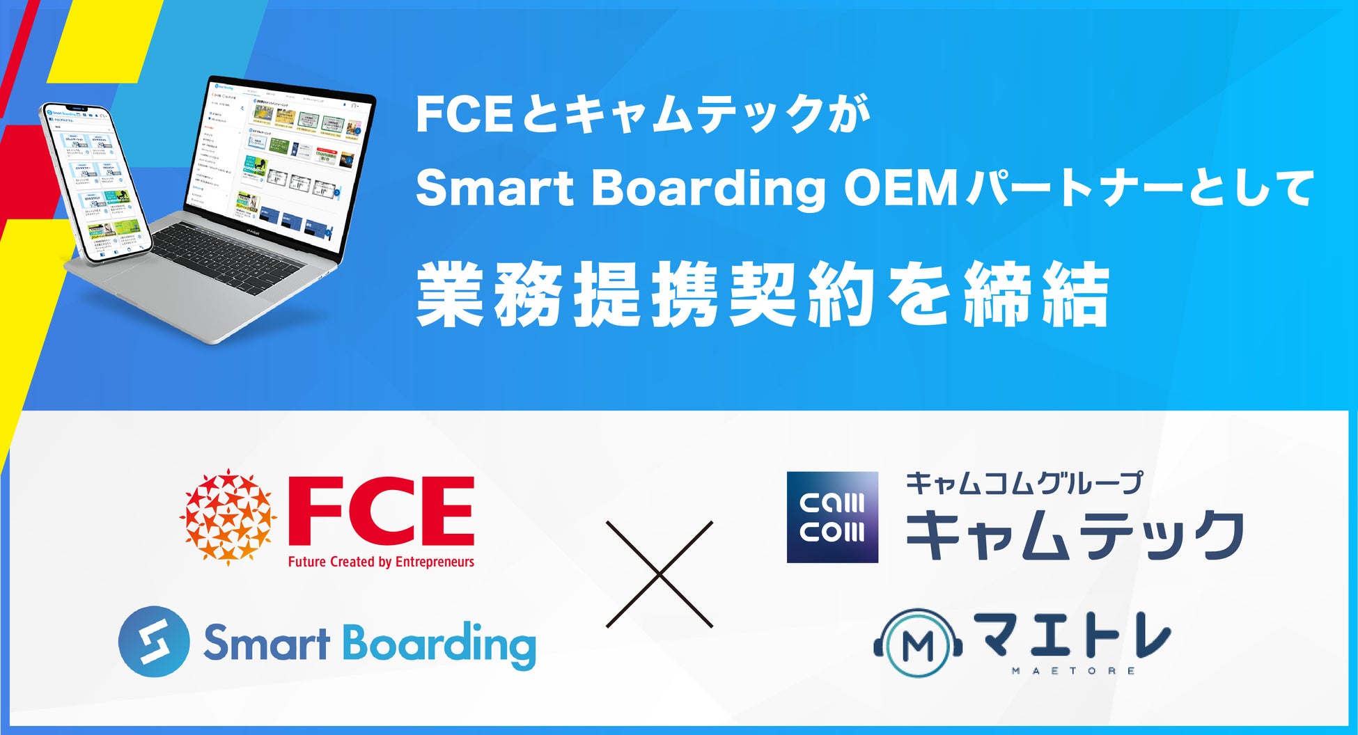 株式会社FCE(本社:東京都新宿区、代表取締役社長:石川淳悦、証券コード9564、以下:FCE)は、「Smart Boarding」(スマートボーディング)(https://www.smartboarding.net/) のOEMパートナーとして 、新たに株式会社キャムテック(本社:東京都港区、代表取締役:西野弘一・縄田崇、以下:キャムテック)と業務提携契約を締結いたしました。