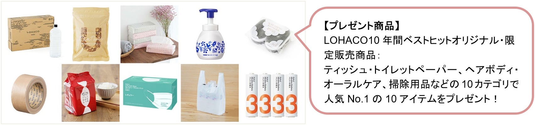 サービス開始以降、お客様から多くの支持をいただいているオリジナル・限定販売商品について、10年間(※2)で各カテゴリで人気No.1(※3)の商品10点をセットにし、抽選で39名様にプレゼントします。10周年誕生祭期間中、 LOHACO本店で1回のご注文で税込6,000円以上ご購入およびメールマガジンを購読(11月1日時点)の両条件を満たしているお客様が対象となります。どうぞお見逃しなく!