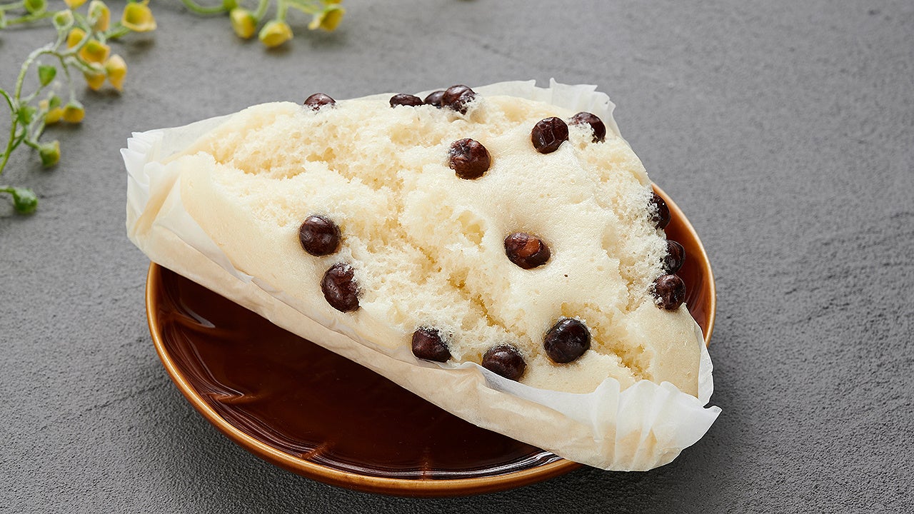 白こしあん風味の白い蒸しパンに塩豆をトッピングしました。ラップで包まれた見た目もレトロな蒸しパンです。