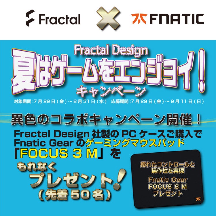 Fnatic Gearは、ワールドワイドで活躍するプロゲーミングチーム「Fnatic」が設立したプロフェッショナルゲーミングデバイスのブランドです。そのFnatic Gearが開発した優れたコントロールと滑らかな操作性を実現するゲーミングマウスパッド「FOCUS 3 M」を、Fractal Designの定番ケースをご購入いただいた方に先着でプレゼントいたします。