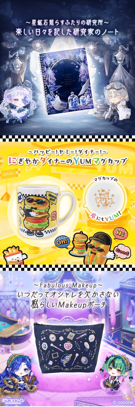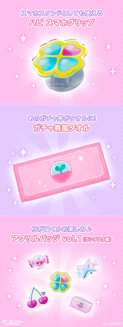 『ポケコロツイン』初となる、公式オリジナルグッズの受注販売を絶賛受付中です。ラインアップとして、ガチャの多彩で幻想的な世界観を落とし込んだ特別なノートやマグカップ、ポーチ、さらにはお馴染みのハピやガチャ券などのデザインを利用したユニークなスマホグリップやタオル、アクリルバッチを展開します。