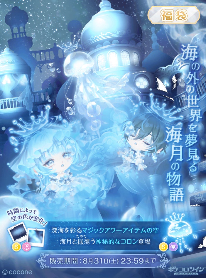 4.5周年を盛り上げる新作の福袋(着せかえアイテム)が登場。今回のテーマは幻想的な“海月のお姫様”で、時間によってココリウムの背景色が変わるマジックアワーアイテムも見どころです。
