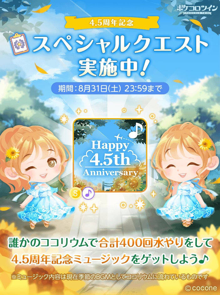 ココネ株式会社(以下「ココネ」)は、アバターの着せかえやお客様同士のコミュニケーションを楽しむスマートフォン向けアプリ『ポケコロツイン』において、2024年8月27日(火)にサービス開始から4.5周年を迎え、アニバーサリーイベントを開催することをお知らせします。