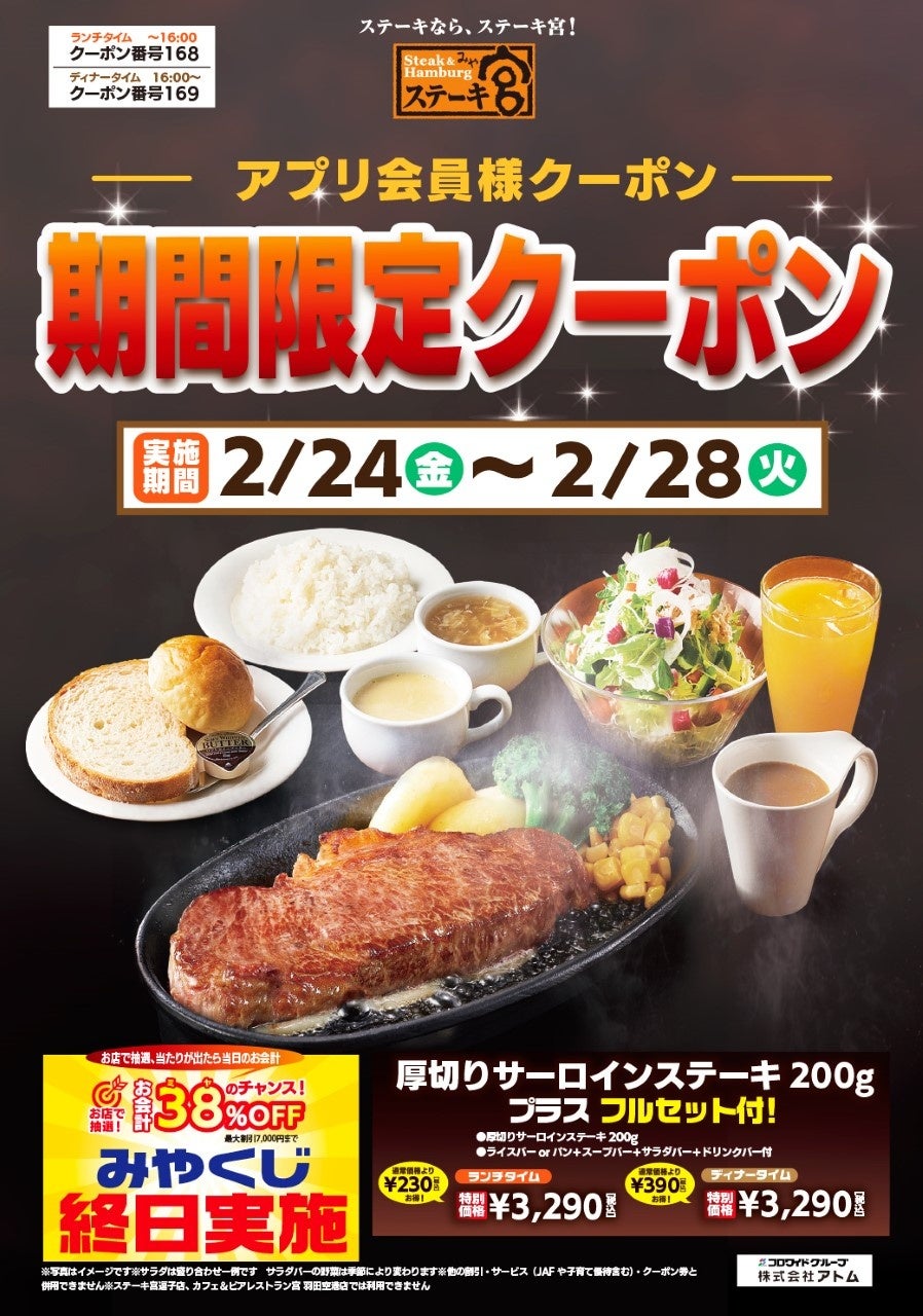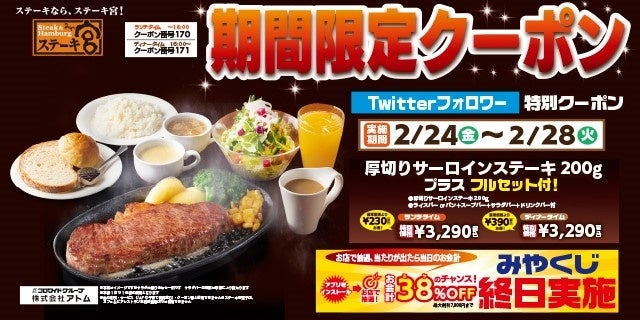 コロワイドグループの株式会社アトム(本社:神奈川県横浜市、代表取締役社長:山角豪)は、「ステーキ宮」各店で、2023年2月24日(金)から、2023年2月28日(火)までの5日間「期間限定クーポン」をアプリ会員とTwitterフォロワー限定で販売いたします。