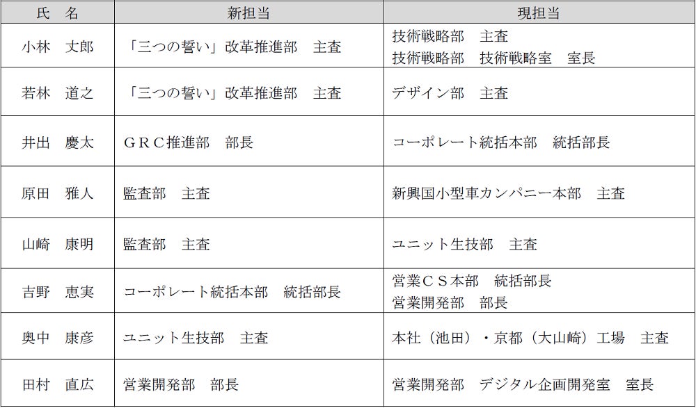 ダイハツ工業株式会社(以下、当社)は、2024年4月1日付にて組織改正、幹部職の人事異動を行います。