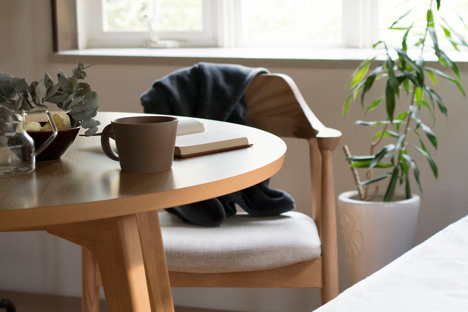 柄やプリントが表にない単色のシンプルなマグカップ。