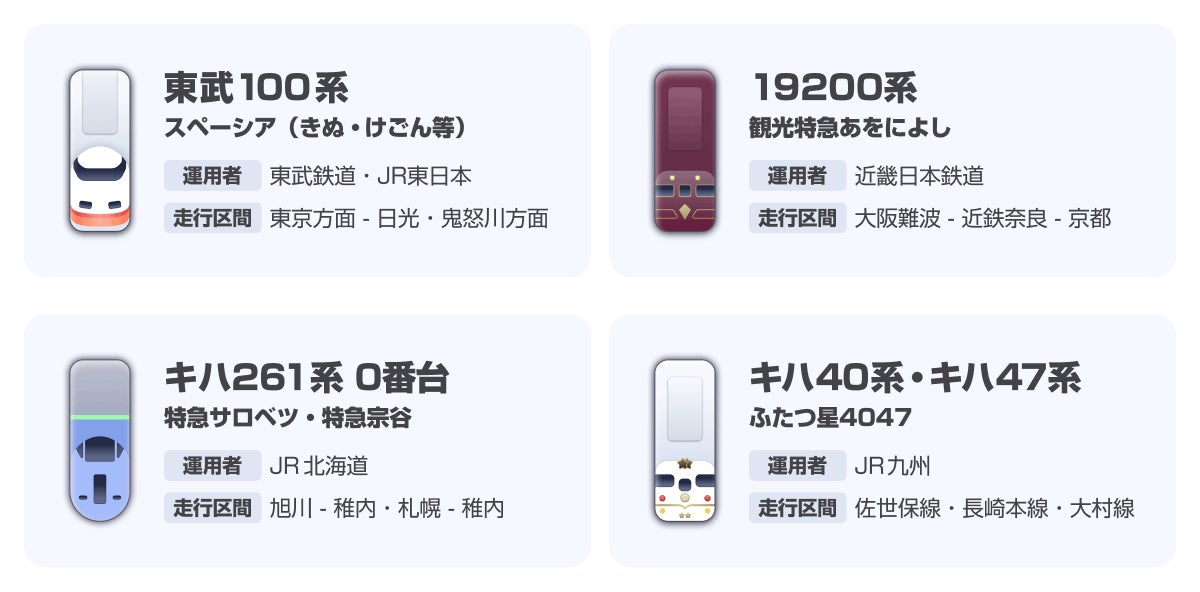 全国で運行されている有料列車のうち、特徴のある75種類をアイコンで表示しています。地方で運行されている列車に加え、JR九州「ふたつ星4047」のように運行本数の少ない珍しい列車や、昨年、運行を開始した近畿日本鉄道「観光特急あをによし」などの新しい列車も表示しているため、普段はなかなか乗ることのできない列車を眺めて楽しむこともできます。