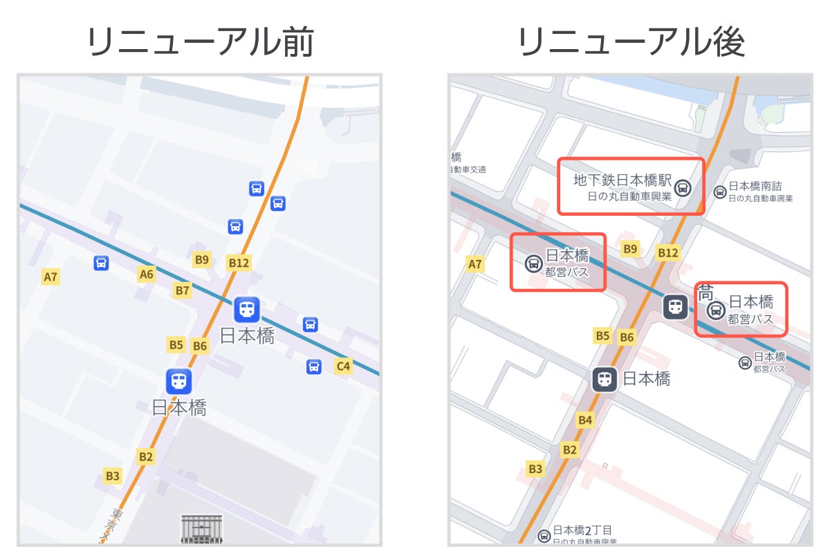 「公共交通マップ」は、地下鉄以外のJRや私鉄、新幹線を路線カラーで色分け、駅名の表示サイズを大きくしたことに加え、バス停名とバス会社名も地図上に表示することで、より見やすく使いやすいデザインにしています。