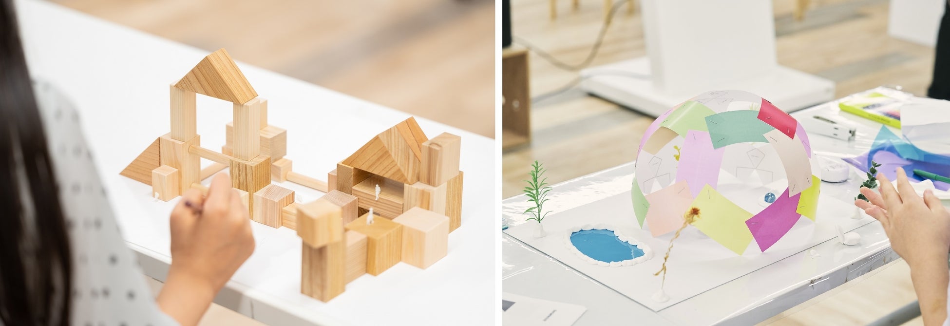 来館者が模型作りを体験できるエリアを設置します。映像を見ながら、積み木を使ったお家作りや、色紙を使用したドーム作りを常時体験いただけます。
