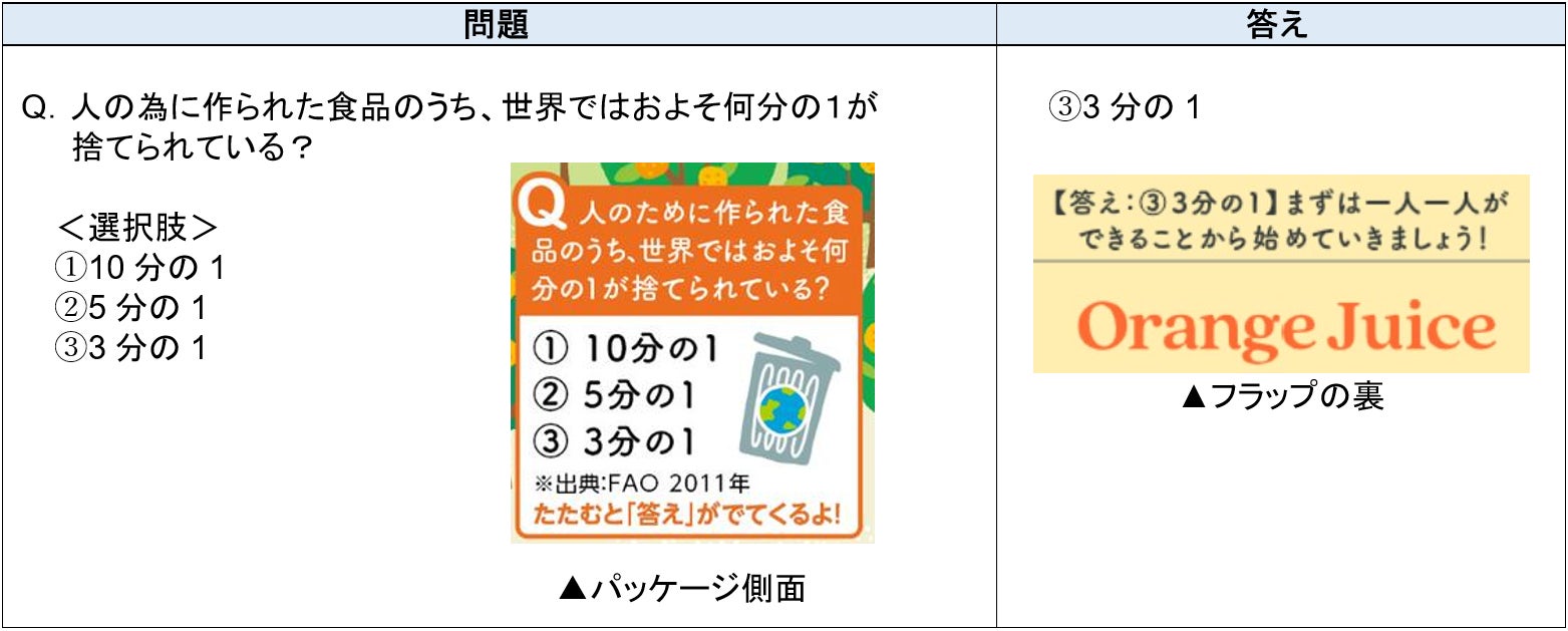 本商品は、上記のカゴメの取組みから得た知見を活かし、パッケージの側面に記載した環境や食育に関するクイズの問題文の中に、「たたむと『こたえ』がでてくるよ!」というメッセージを記載しました。クイズの答えを見るためには飲み終わった紙パックをたたむ必要があるため、親子で一緒にクイズを楽しみながら、自然に「たたんで捨てる」習慣をつけられることを期待しています。