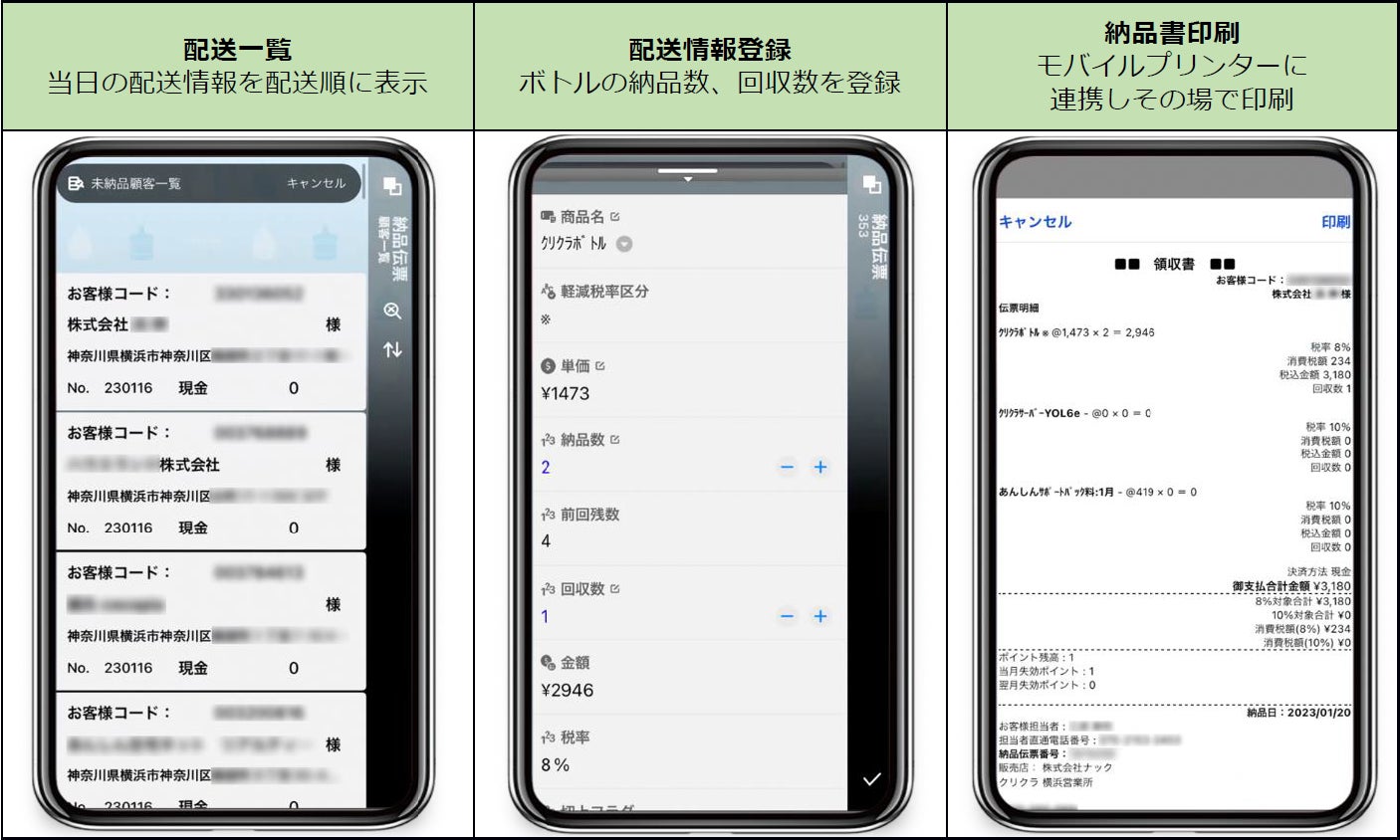ナックは、現在直営店のみの導入となっているこのアプリを、配送員の業務負担や残業時間を大幅に削減し物流の2024年問題にも関わる新たな取り組みとして今後は加盟店にも展開し、クリクラ事業ネットワーク全体のサービス品質向上や業務効率化をさらに進める計画です。