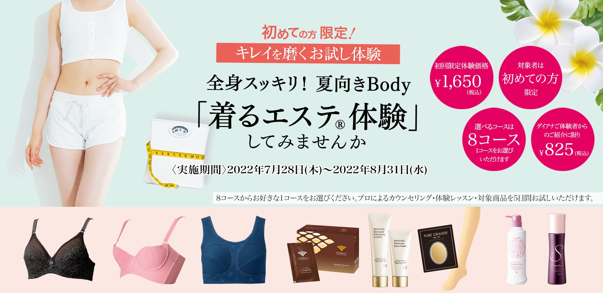 | 体験コース | ① 真実の「着るエステ®」体験 ―豊富な69サイズから選ぶ補整下着「ダイアジェンヌ ブラジャー」の体験 ② 魅力ボディ体験 ―バストラインを盛って魅せる!補盛下着「リセ グラマラス 体験用ブラジャー」の体験 ③ おやすみ中のしっかり補整体験 ―寝ている間も快適ボディメイキング「ナイトジェンヌ ナイトブラ」の体験 ④ ダイエットでヘルシーボディ体験 ―置き換えダイエットをサポートする栄養補助食品「セルディア」の体験 ⑤ 生まれ変わった、わたしの肌ケア体験 ―しっかり洗浄、なのにうるおう洗顔「ディアナージュ ケキュア クレンジングクリーム&フェイスフォーム」の体験 ⑥ すらり美脚サポート体験 ―医療用弾性ストッキング「ピュアグランデ No.140」の体験 ⑦ 気なる部分の集中ケア体験 ―マッサージ後の肌を引き締めるボディケア化粧品「ノエマ プロ ファーミングローション」の体験 ⑧ ふんわりキレイ、ヘアケア体験 ―頭皮環境を整え、発毛を促進する育毛剤「サターシェ 薬用育毛エッセンス」(医薬部外品)の体験 |
