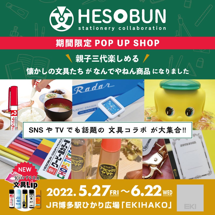 マジックインキ、フエキ糊、Radar、よいこのおどうぐばこ、ツバメノート、アラビックヤマトなど、有名文具メーカーとのコラボにより新しい角度で文房具の楽しさを伝える「なるへそ!」な文具、「へそ文-HESOBUN-」のポップアップショップが、JR博多駅ひかり広場 「EKIHAKO MINI」に期間限定オープン!有名文具メーカーとのコラボ商品をはじめ、使う人が「なるへそ!」を体感できる話題のアイテムたちが大集合!雑貨やふりかけ、お菓子など、楽しいグッズを取り揃えて皆様のお越しをお待ちしております。