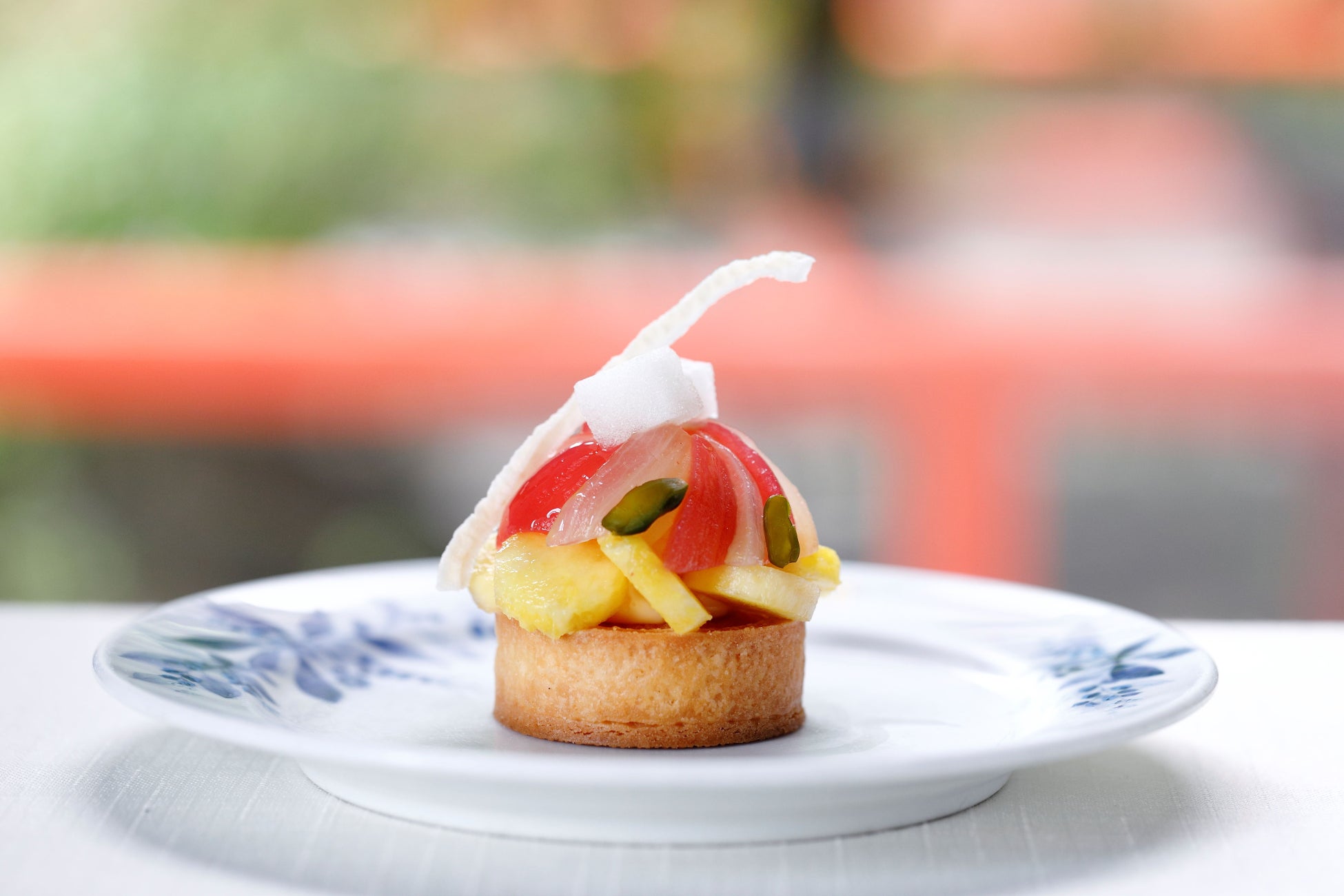 アーモンドクリームに、玉葱のスライスを並べ焼き上げた香ばしいタルト台に、チーズクリームを合わせ、パイナップル、ピスタチオ、玉葱をトッピングいたしました。トッピングの玉葱には苺・パッションフルーツのシロップに漬け込んだ玉葱のコンポートや、玉葱の泡のゼリー、砂糖をまぶし乾燥させた玉葱など、アレンジを効かせ、様々な食感をお楽しみいただけます。玉葱がそれぞれの食材を引き立て、噛むと口の中で広がる淡路島産玉葱ならではの甘さをご堪能ください。