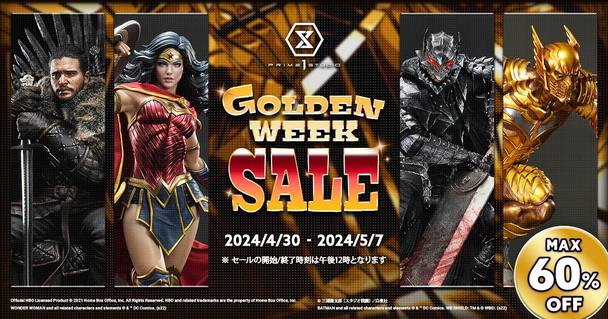 待ちに待った大型連休がついにスタート。プライム1スタジオでは対象のスタチューが最大60%OFFになる、『ゴールデンウィークセール』を4月30日(火)12:00から5月7日(火)12:00まで開催します!