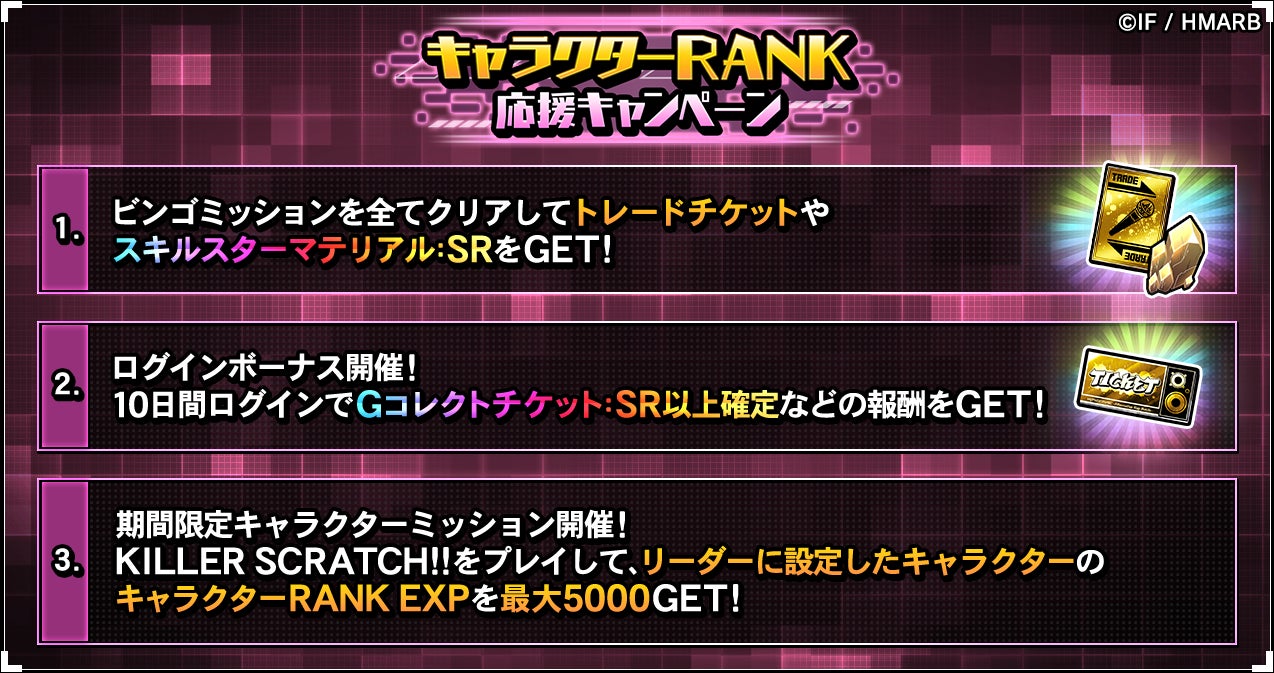 期間中、キャラクターRANK EXPを各キャラクター最大5,000獲得できるキャラクターミッションをはじめ、ビンゴミッションやログインボーナスを開催しています。ログインボーナスでは「Gコレクトチケット:SR以上確定」を入手することもできます。詳細はアプリ内お知らせをご確認ください。
