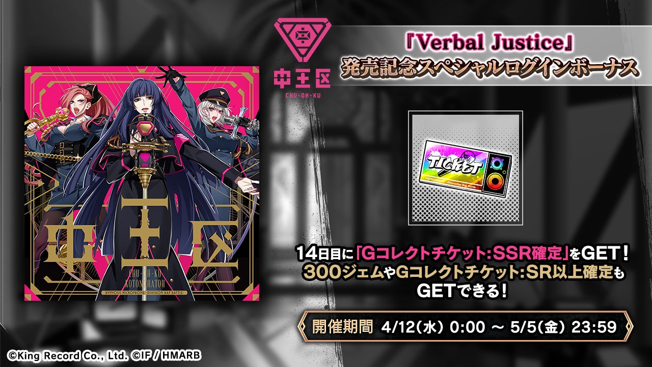 『Verbal Justice』の発売を記念したスペシャルログインボーナスを開催しています。ログインから14日目に「Gコレクトチケット:SSR確定」を入手できます。詳細はアプリ内お知らせをご確認ください。