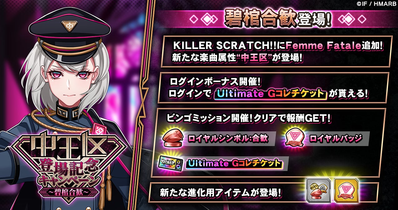 新Ultimateカード「SSR【中王区 言の葉党】碧棺合歓」を獲得することができるGコレクトを開催しています。中王区登場を記念した「中王区登場記念キャンペーン~碧棺合歓~」も同時開催中です。
