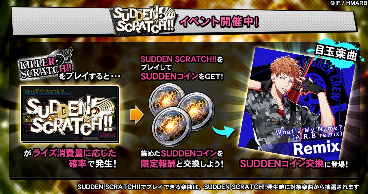 イベント期間中、KILLER SCRATCH!!をプレイするとライズ消費量に応じた確率でSUDDEN SCRATCH!!が発生します。SUDDEN SCRATCH!!をプレイすると、通常の報酬アイテムの他、限定アイテム「SUDDENコイン」を獲得することができます。「SUDDENコイン」を集めることで、新楽曲「What’s My Name?(A.R.B remix)」と交換することが可能です。詳細はアプリ内お知らせをご確認ください。