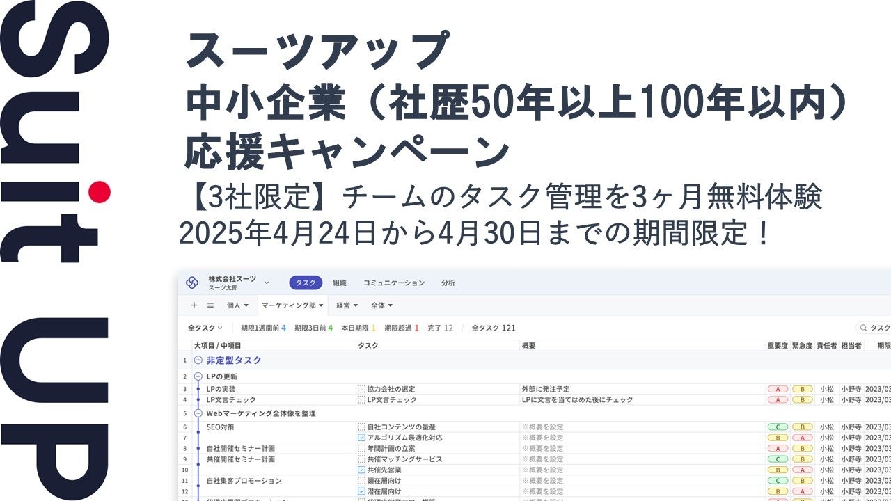 株式会社スーツ(所在地:東京都千代田区、代表取締役社長CEO:小松 裕介)は、チームのタスク管理・プロジェクト管理ツール「スーツアップ」において、中小企業(社歴50年以上100年以内)応援キャンペーンを実施いたします。