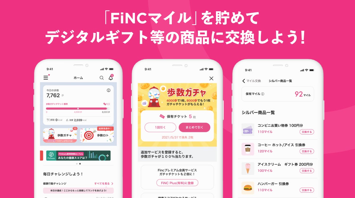 歩数ロトや歩数ガチャ、体組成計からの体重記録等でFiNCマイルを貯めることができ、貯まったFiNCマイルはデジタルギフトや豪華商品に交換することできます。