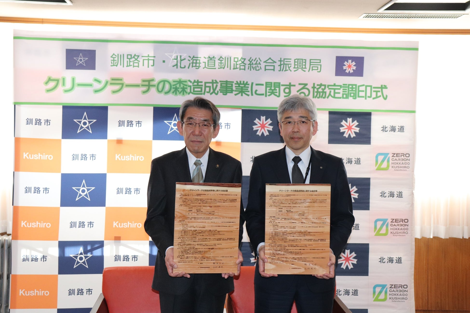 釧路市(市長 蝦名大也)と北海道釧路総合振興局(振興局長 木村英也)は、ゼロカーボン北海道及び釧路管内の自然環境に配慮した森林づくりに資するため、森林整備による地球温暖化の防止に貢献するとともに、日本最大の湿原である釧路湿原等の自然環境保全に貢献することを目的とした協定を令和6年3月19日に締結しました。