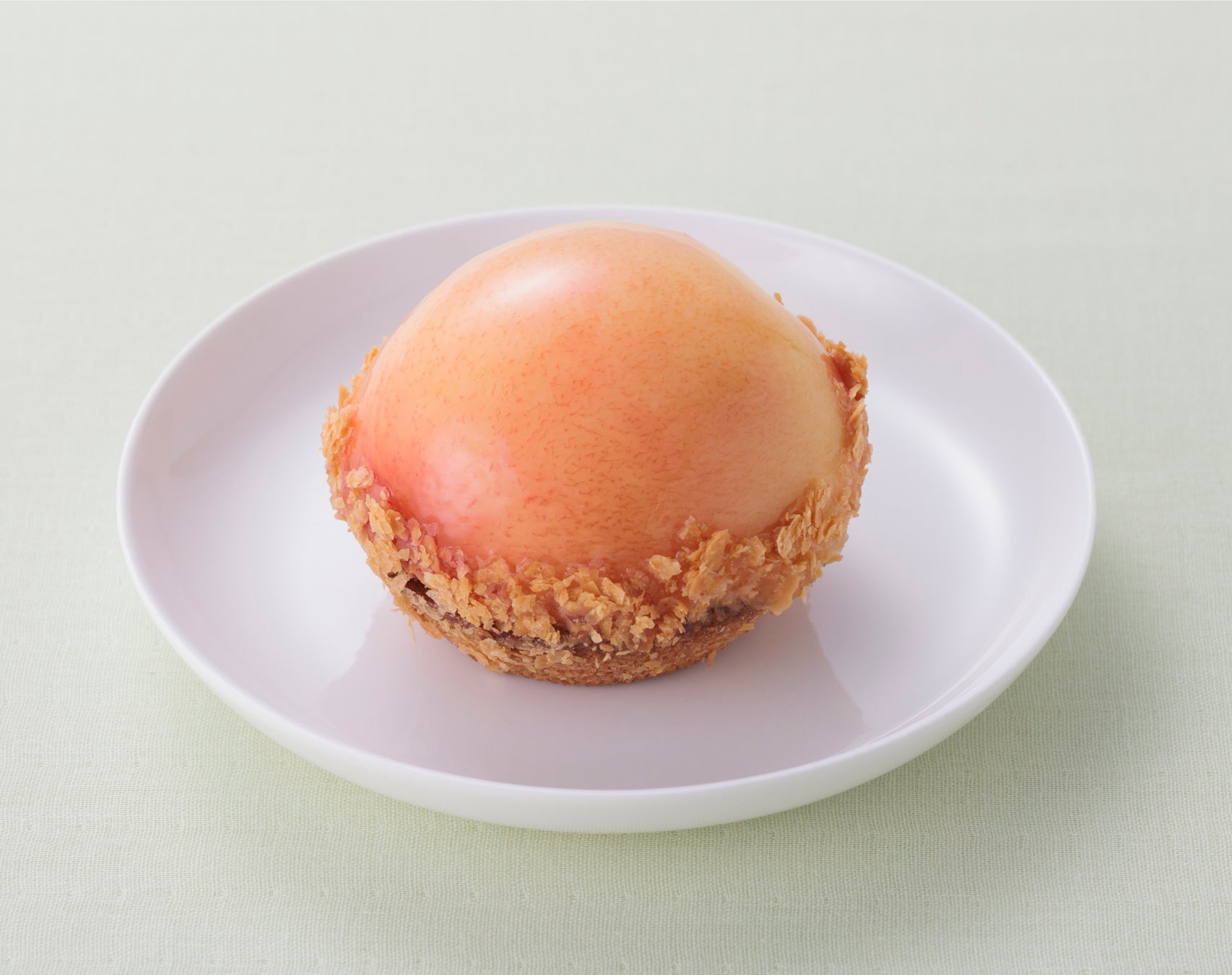 フランボワーズのジャム入りタルトの上に、福島県産の桃をのせ、アクセントにミントブランマンジュをあわせました。