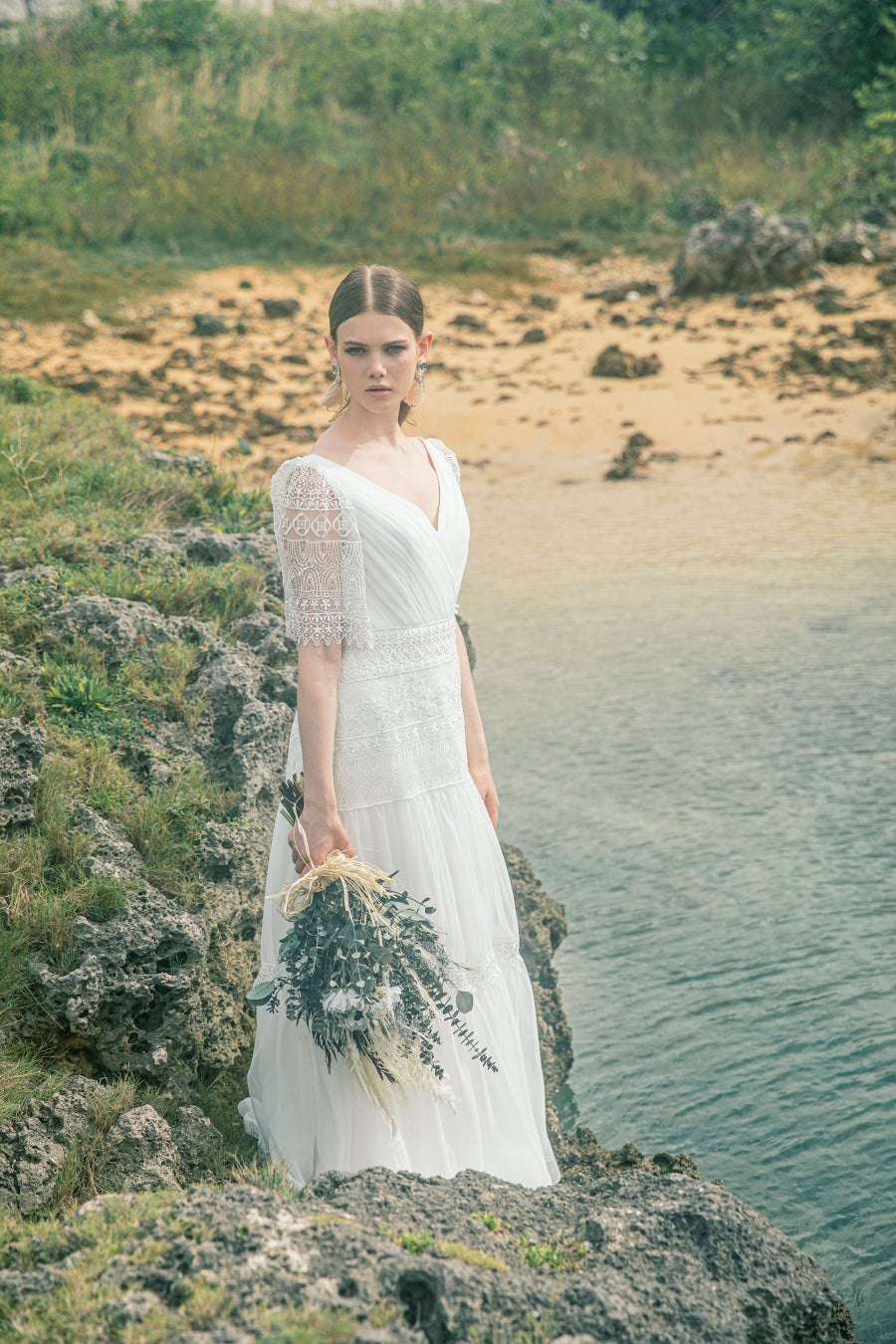 スタイリッシュな印象のシルエットに、ナチュラルなケミカルレースを使用することで、飾らない高級感を演出します。軽やかな素材が風になびきビーチリゾートにぴったり。繊細なドレープをあしらった深めのVネックは華やかで、かつ顔周りをすっきりと見せてくれ、バックのVカットにはレースをあしらいフェミニンな印象になります。