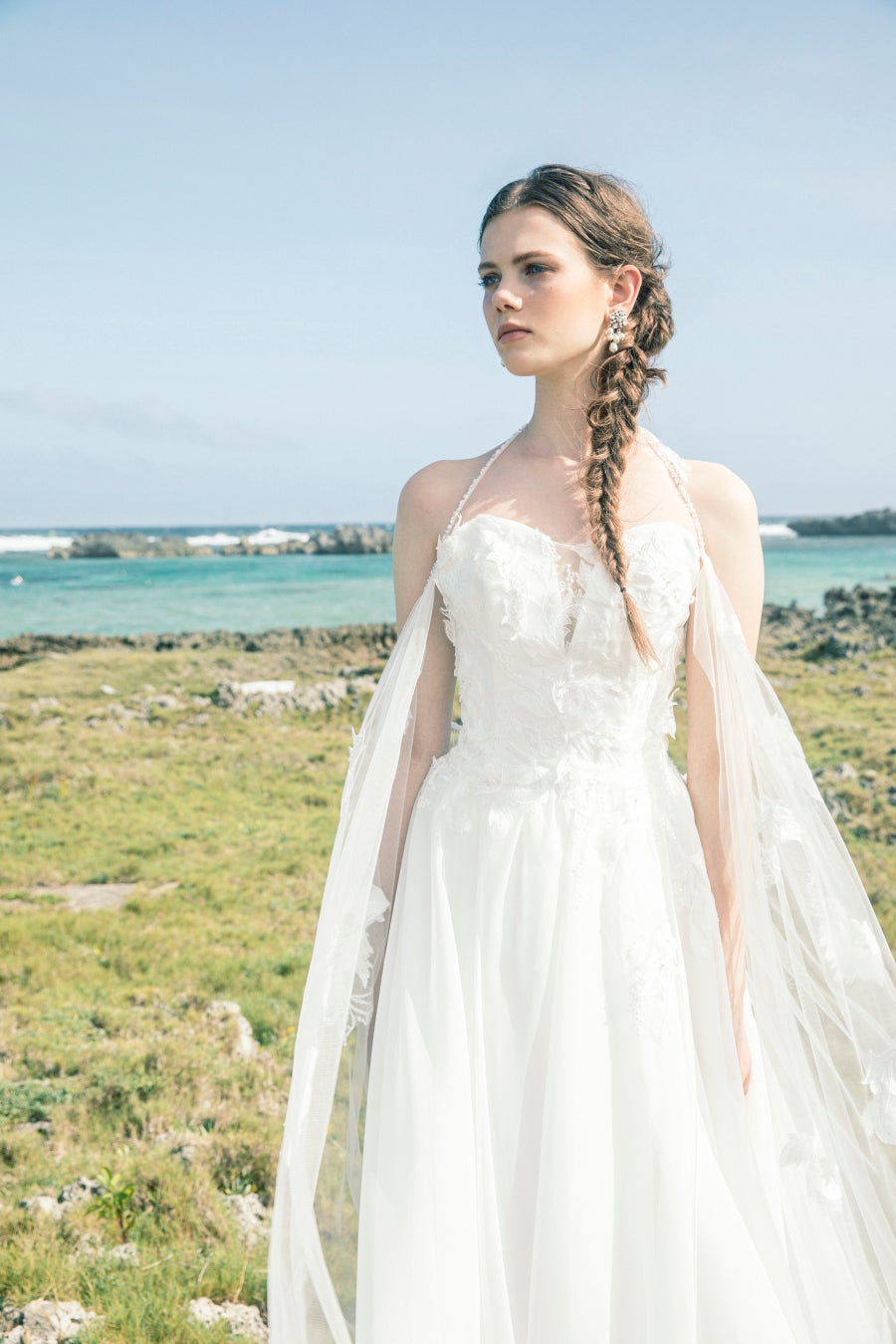 風になびくロングケープには羽の形のレースを立体的にあしらい、軽やかな仕立てに。胸元は深めのVカットにレースをのせることで、洗練された透明感のある印象になります。