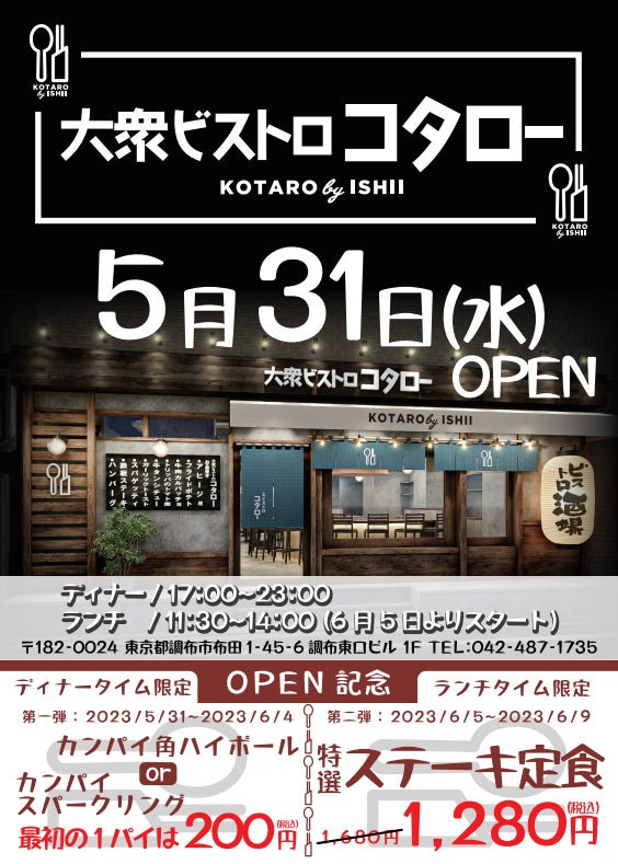 【オープン直前!追加情報 】毎日通いたくなる!『大衆ビストロ コタロー調布店』いよいよ本日プレオープン、6/5(月)グランドオープン!!