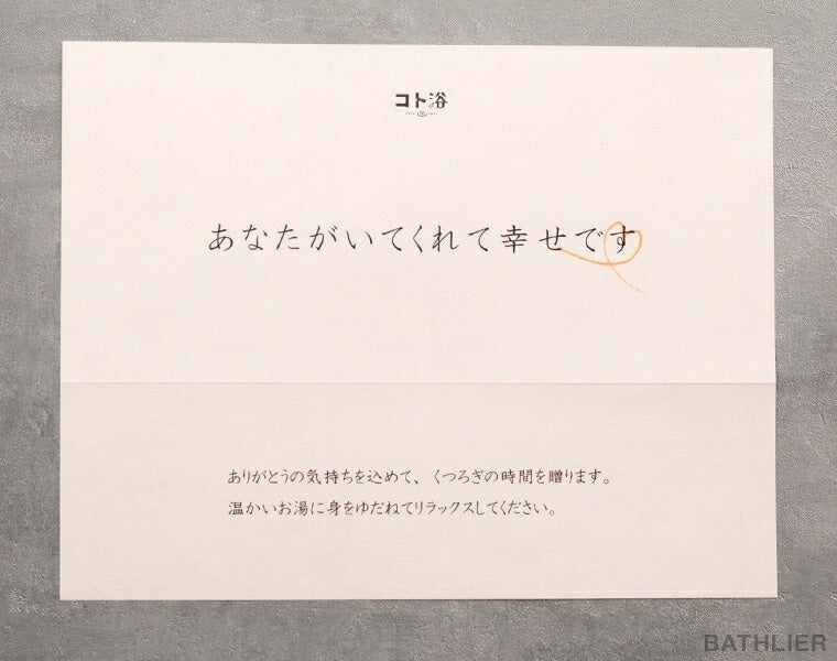 大人になると、照れくさくて感謝の気持ちをなかなか直接伝えられないもの。「コト浴 セレクションセット」には、そんなあなたの想いをメッセージにしたためて同封しております。