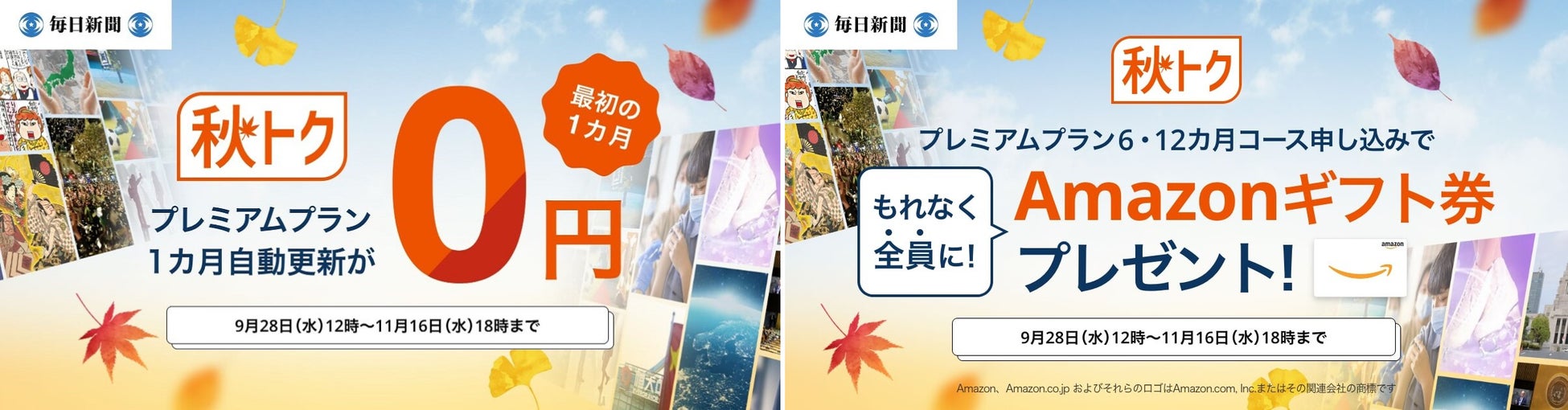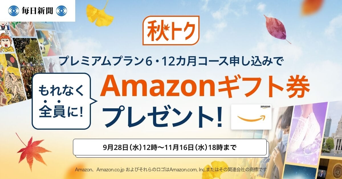 プレミアムプラン1カ月自動更新は初月0円、「6カ月コース」「12カ月コース」はもれなく全員にAmazonギフト券をプレゼント! 毎日新聞デジタル『秋トク』キャンペーン開始