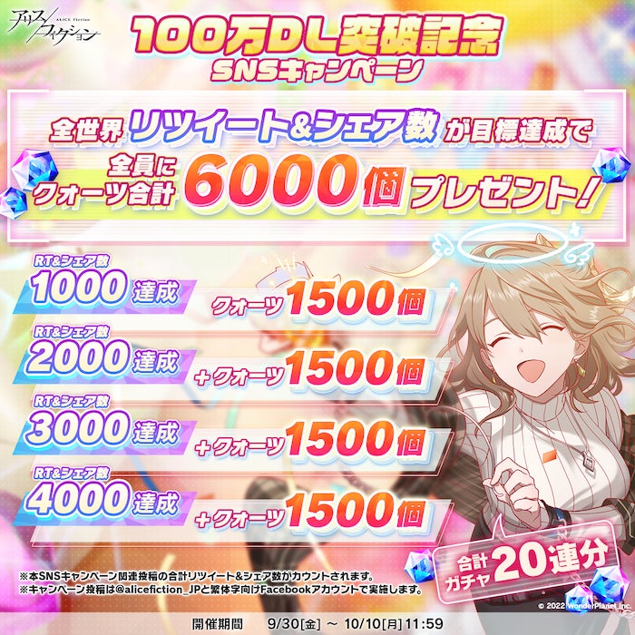 『アリスフィクション』の100万ダウンロード突破を記念して「100万DL突破キャンペーン」第1弾を、本日から開始いたします。