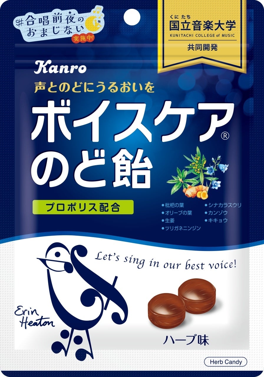 「ボイスケアのど飴」は、国立音楽大学声楽専修の教授監修のもと学生の声を聞きながら、試作を繰り返してつくった「声とのどを大切にする人」のためののど飴です。のどを大切にする人のための商品として原料にもこだわり、のどにやさしいハーブを使用しました。心地よい刺激に調整したプロポリスを配合することで、ほどよいメントール感のある味わいに仕上げました。