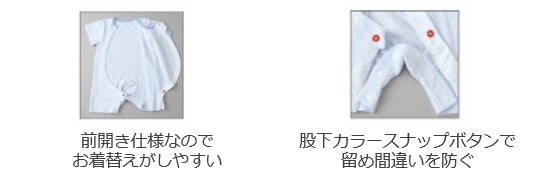 プレオールなので足の動きが活発な赤ちゃんにおすすめ。前開き仕様なので寝ている赤ちゃんのお着替えも簡単にできます。