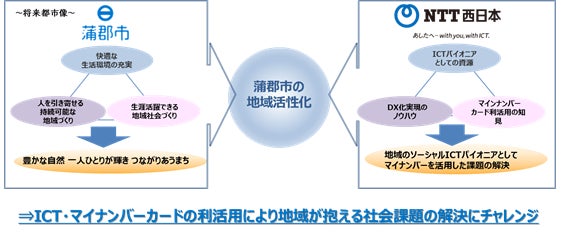 本協定は、第五次 蒲郡市総合計画の「まちづくり戦略」に示す、①快適な生活環境の充実、②生涯活躍できる地域社会づくり、③人を引き寄せる持続可能な地域づくりの実現に向け、NTT西日本が有するICT・マイナンバーカード利活用の知見及び資源等を活用し、地域課題の解決や地域経済の発展につなげていくことを目的としております。