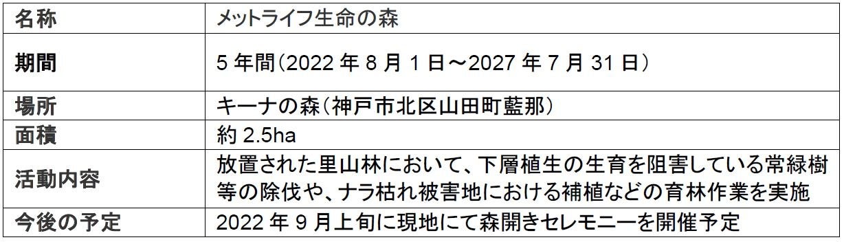 今回の取り組みについて、当社の代表執行役 会長 社長 最高経営責任者 ディルク・オステインは次のように述べています。「メットライフ生命は、環境保護活動として廃棄物の削減、ペーパーレスの推進、エネルギーの節減、温室効果ガス排出量の削減、再生 エネルギーおよび再生可能素材利用拡大などに取り組んでいます。2005 年に神戸サイトを開設し、現在では 500 名以上の社員が ONE KOBE の精神で業務に従事する重要拠点の一つです。私たちはよりたしかな未来に向けて、健全な森林育成を通じた環境保護活動に取り組みたいと考えています。今後も常に人々に寄り添いながら、豊かな地域社会の創造に貢献してまいります。」