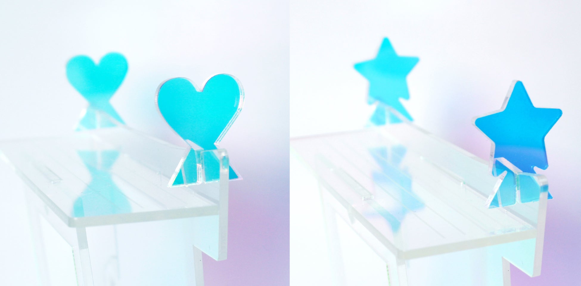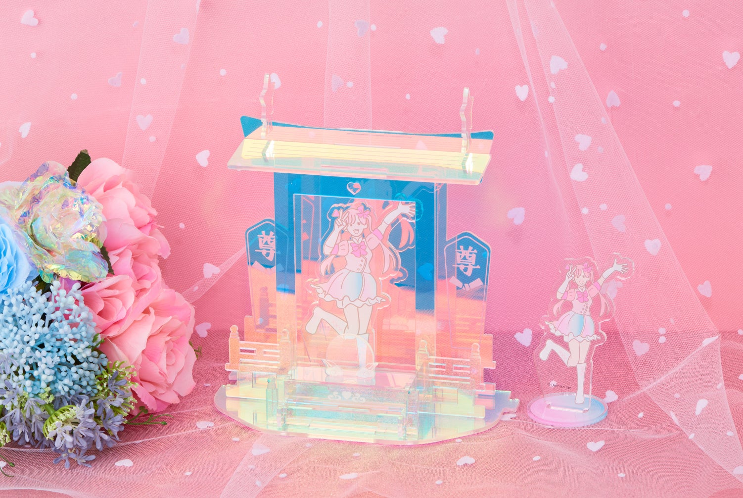 推しの輝きがより一層増す、大好評のオーロラ×アクリル仕様で、お部屋での存在感も圧倒的。推しがオーロラ色に輝く姿は、深いため息がでるほどの尊さです。付属のおまけパーツで、神棚をあなただけの推し仕様にカスタマイズすることができます。