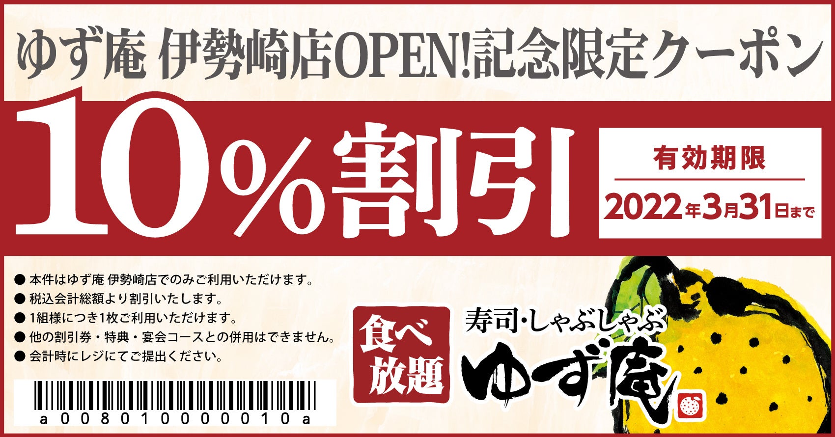 オープン記念として、2022年3⽉31⽇(木)までご利⽤いただける『寿司・しゃぶしゃぶ ゆず庵 伊勢崎店』限定の10%割引クーポンをwebにて配信いたします。
