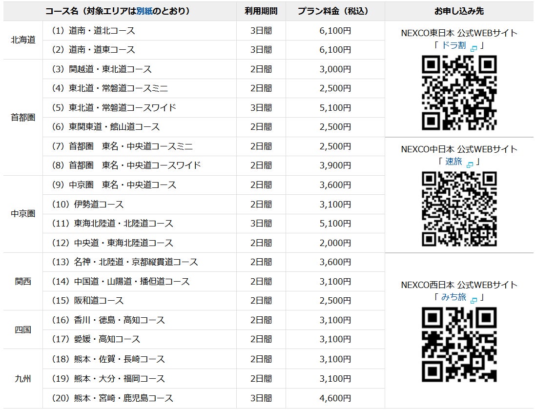 ― 全20コースを設定!出発前に申し込めば、対象エリアの高速道路が定額料金で乗り降り自由! ―