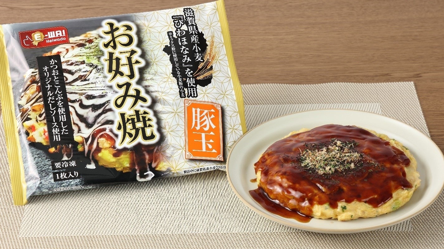 「E-WA! お好み焼き 豚玉」は、滋賀県産の小麦であるびわほなみを使用し、小麦の風味とふっくらもちっとした食感に仕上げました。また、こだわりのソースは、かつおとこんぶを使用しただしがきいたオリジナルで、生地にぴったりの美味しさです。