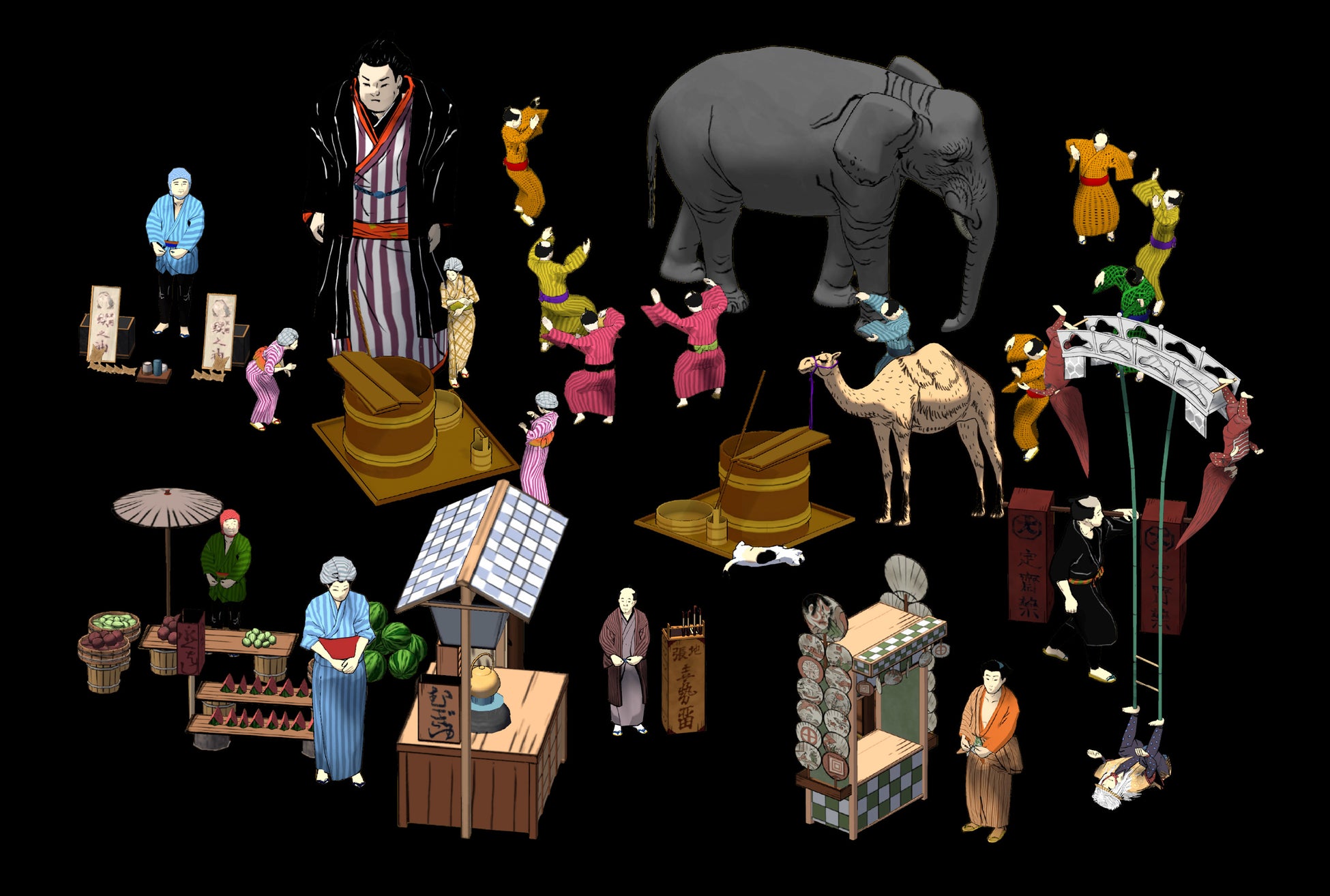 江戸の盛り場だった両国広小路。江戸東京博物館にある両国橋西詰模型をもとに、夏の両国橋と両岸の広場、そして隅田川を3D空間で再現しました。多様な人やものが行き交う舞台には、収蔵品から選ばれた100点のアイテムが、いたるところに隠れています。