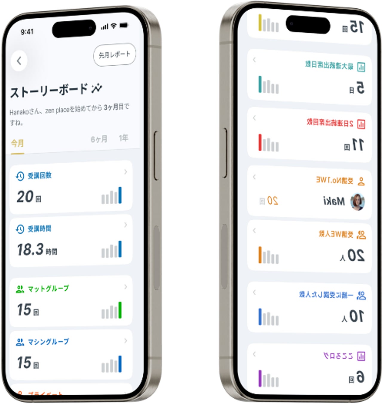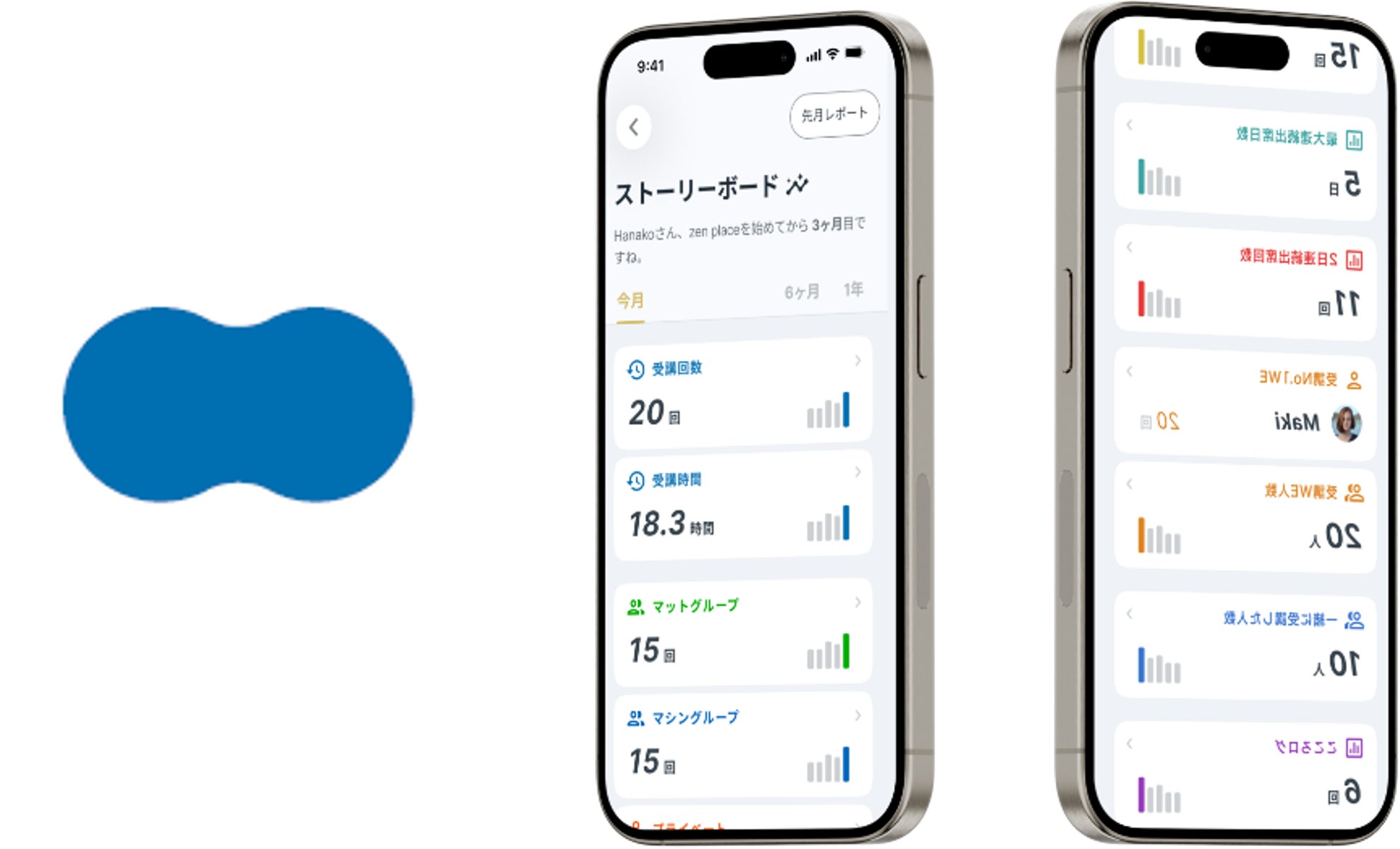 zen placeがスタジオ・オンラインで提供しているレッスン受講のデータを多角的に集計し、リアルタイムで積み重ねていくことで、受講体験の楽しさを提供していきます。受講回数や時間、連続出席回数、受講したレッスンの種類、出席頻度の高いエデュケーター(インストラクター)、一緒にスタジオ受講した人数、さらにはZEN PLACE独自のAI解析サービスの利用回数などが、収集結果として蓄積されていきます。シンプルかつ、斬新な切り口のデータ達が積み上がっていく喜びを提供するものです。