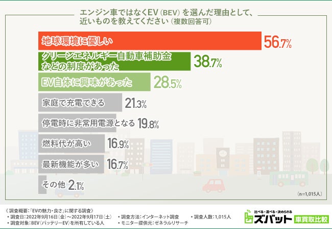 全国地球温暖化防止活動推進センター(JCCCA:https://www.jccca.org/global-warming/knowleadge01)によれば、地球温暖化に最も大きな影響を及ぼす気体は二酸化炭素(CO2)だとされています。そのCO2を一切排出しないEV(BEV)は、地球環境に優しいと考えて、乗り替えする人が多いようです。また、補助金制度があることやEV自体に興味があったことも比較的多い理由でした。