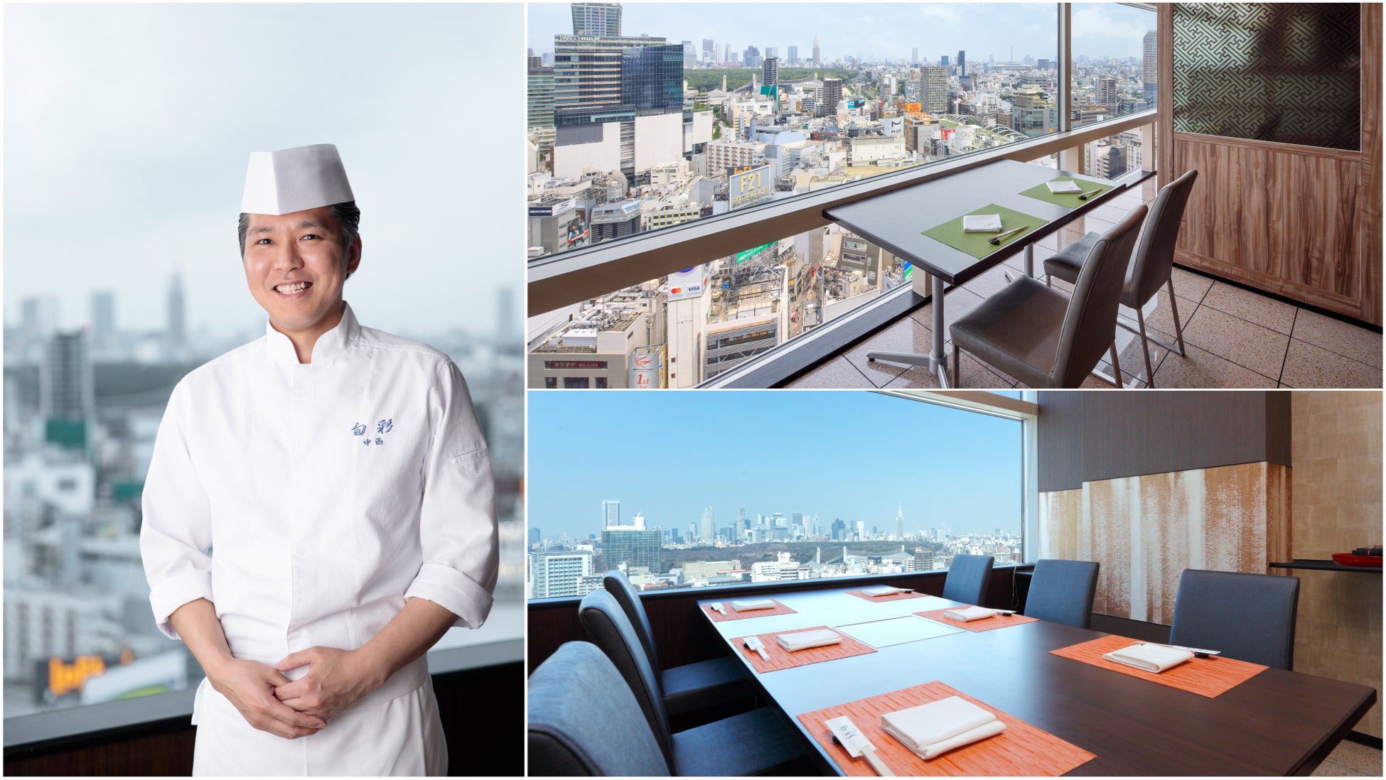 地上100mの絶景を臨む日本料理店。抜群の眺望を誇る個室もあり、ビジネスシーンや晴れやかなお祝いの席にも最適です。ご昼食には彩り鮮やかな御膳を、ご夕食には会席料理を中心にご用意いたします。季節感溢れる華やかな料理をお楽しみください。(画像左:板長 中西 裕一)