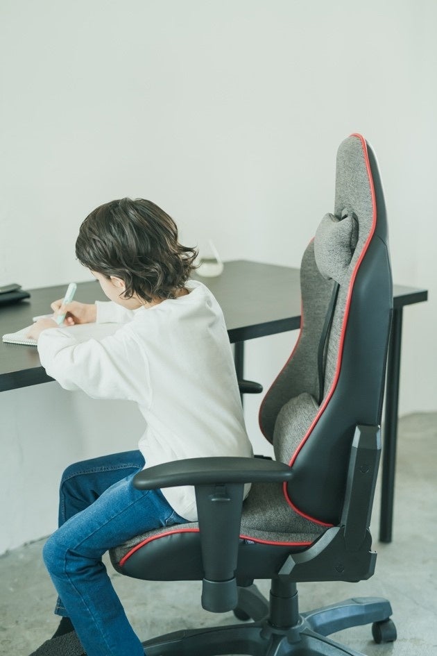 ブラウンとチャコールグレイ(上画像左の2つ)は前面・背面の両面をファブリックとした2カラーリングで、従来サイズのクロスフォーカスのブラウン、チャコールと同配色にすることで、例えば親子でお揃いのチェアを使用することもできます。その他の3カラーリング(上画像右の3つ)は、前面にファブリック、背面にPVCレザーを採用し、より洗練された印象をまとったデザインとしました。