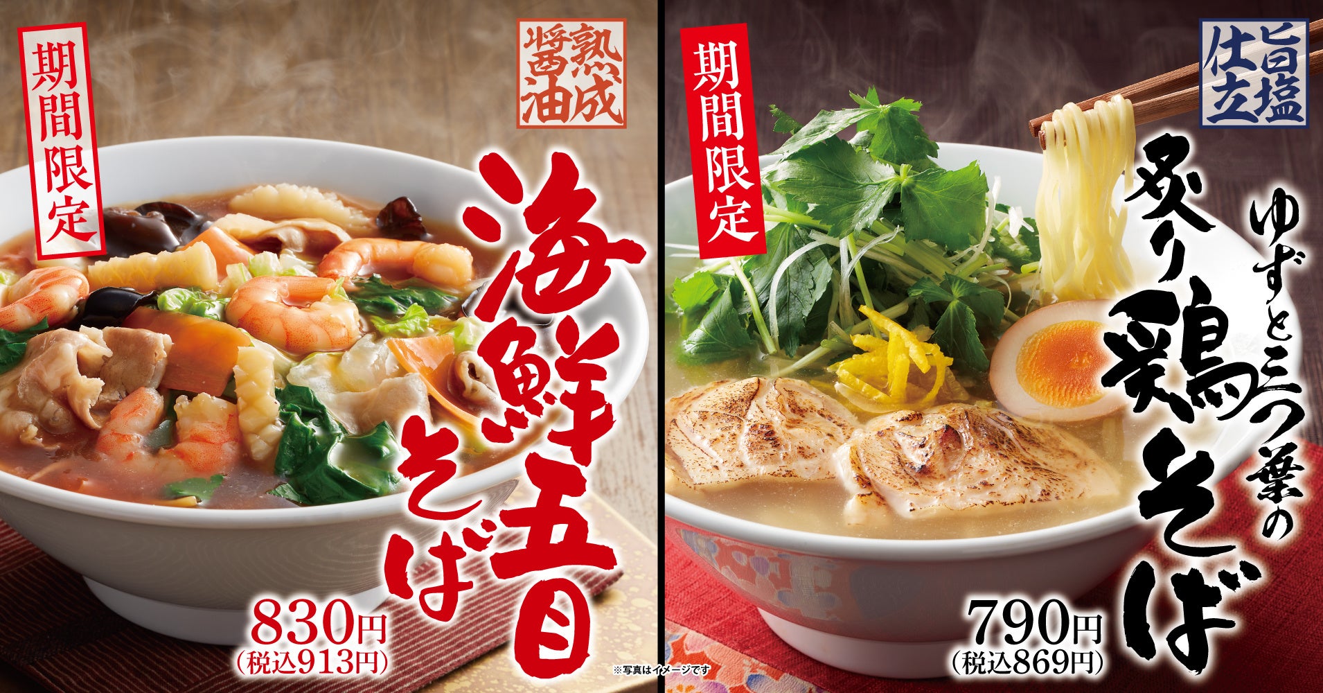 【丸源ラーメン】春の人気商品「ゆずと三つ葉の炙り鶏そば」と「海鮮五目そば」が3月3日(木)より期間限定で登場!