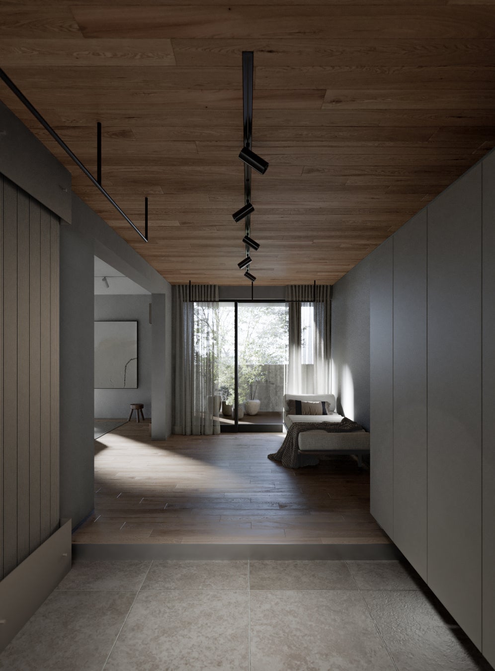 玄関から土間、そしてバルコニーへと、ひとつながりの柔らかな移ろい。光と風、そして緑が流れ込むこの中間領域が、暮らしに呼吸をもたらす。